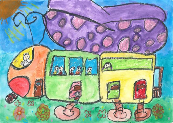 絵の具で描かれた背景もししまいバスを上手く引き立てています。上手に描けています。